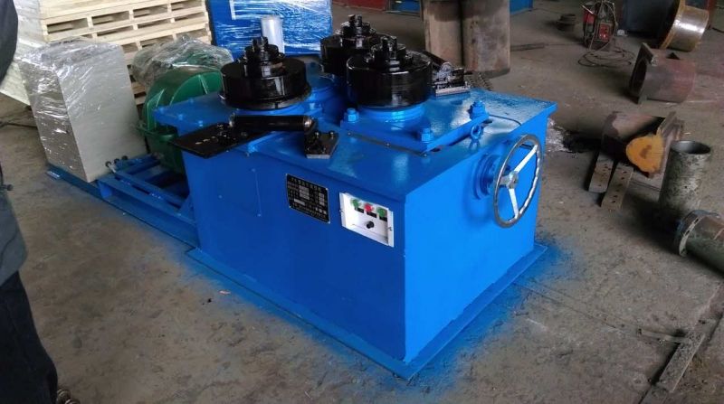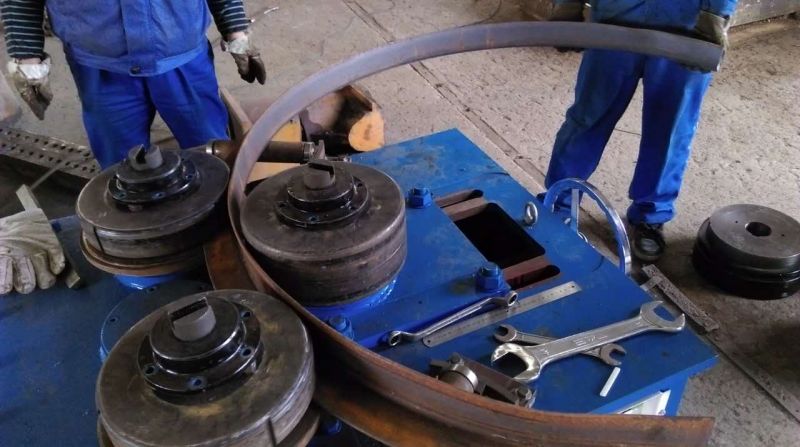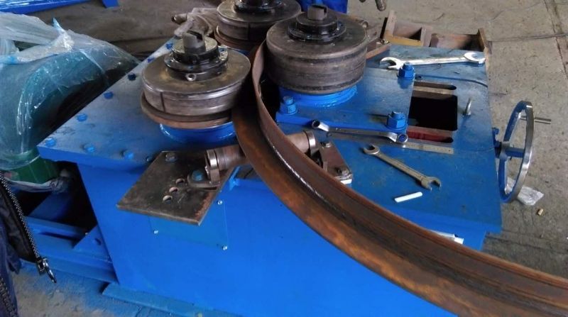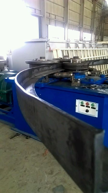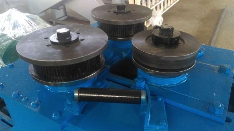 F6型卷圓機(jī)是對稱式三輥型材卷圓機(jī),集機(jī)電一體,將電動機(jī)輸出的較高轉(zhuǎn)速通過傳動裝置、聯(lián)軸器、減速機(jī)、齒輪等轉(zhuǎn)換為所需的大轉(zhuǎn)矩低轉(zhuǎn)速,帶動位置固定的兩主動輥實現(xiàn)旋轉(zhuǎn)運(yùn)動,為型材行走提供扭矩。被動輥通過手輪前進(jìn)、后退實現(xiàn)位移,為卷制型材提供所需的加壓力,位移量由數(shù)字標(biāo)尺實時顯示。三個工作輥成等腰三角形分布,通過移動被動輥位置實現(xiàn)這三個點形成的弧線達(dá)到所需彎曲半徑,即調(diào)整所彎型材的曲率。借助被動輥的壓緊及兩主動輥的旋轉(zhuǎn)運(yùn)動,使型材經(jīng)過多道次連續(xù)彎曲,產(chǎn)生永久性的塑性變形,用于常溫狀態(tài)下將型材卷制成圓形、弧形、螺旋形等工件。